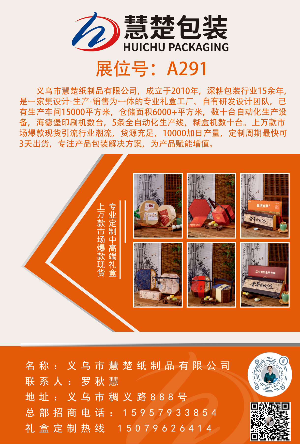 义乌市慧楚纸制品有限公司成立于2010年,深耕包装行业15余年,厂房面积2.3万平方米,是一家集设计-生产-销售为一体的专业礼盒工厂,专注产品包装解决方案,为产品赋能增值。