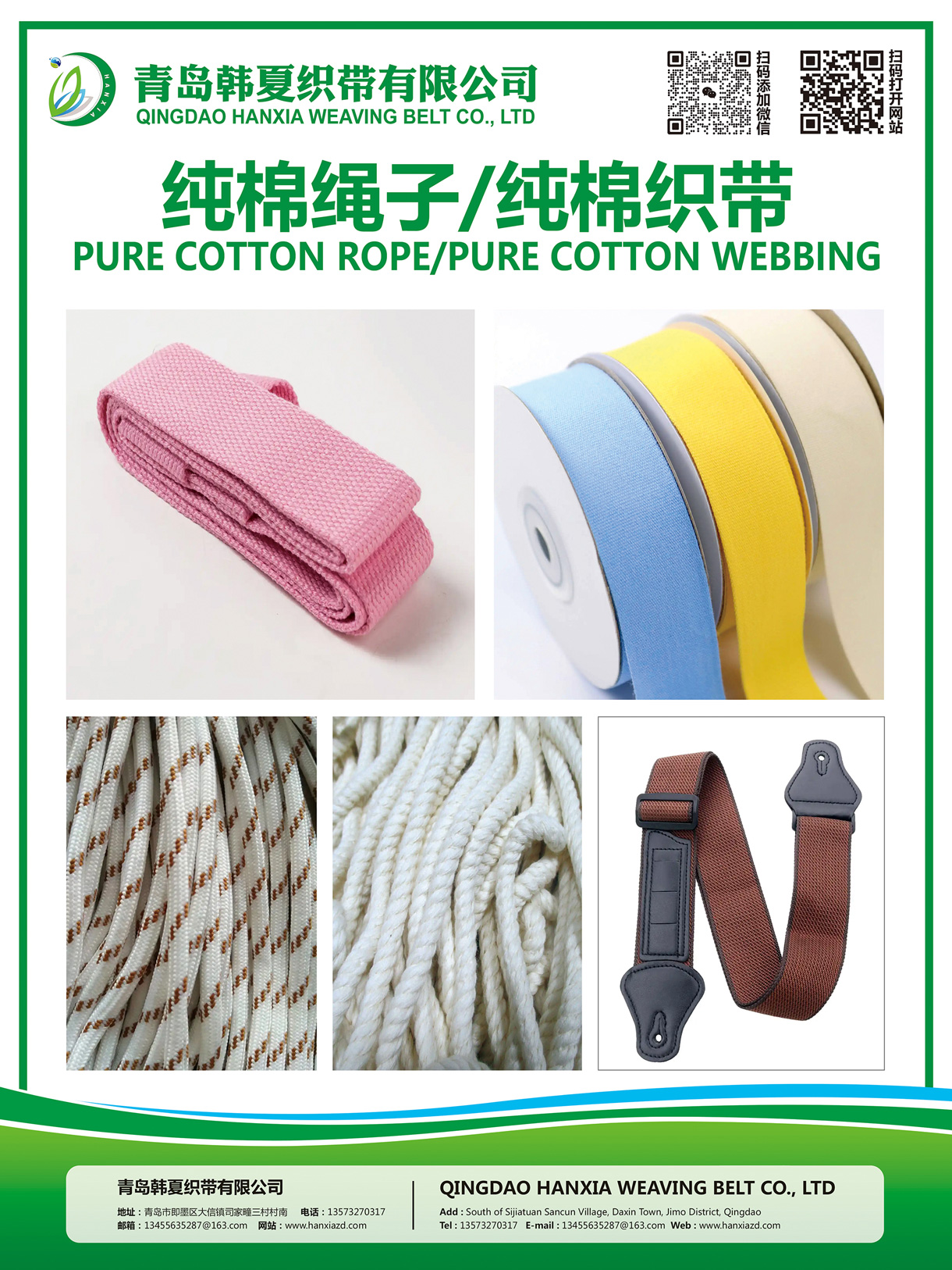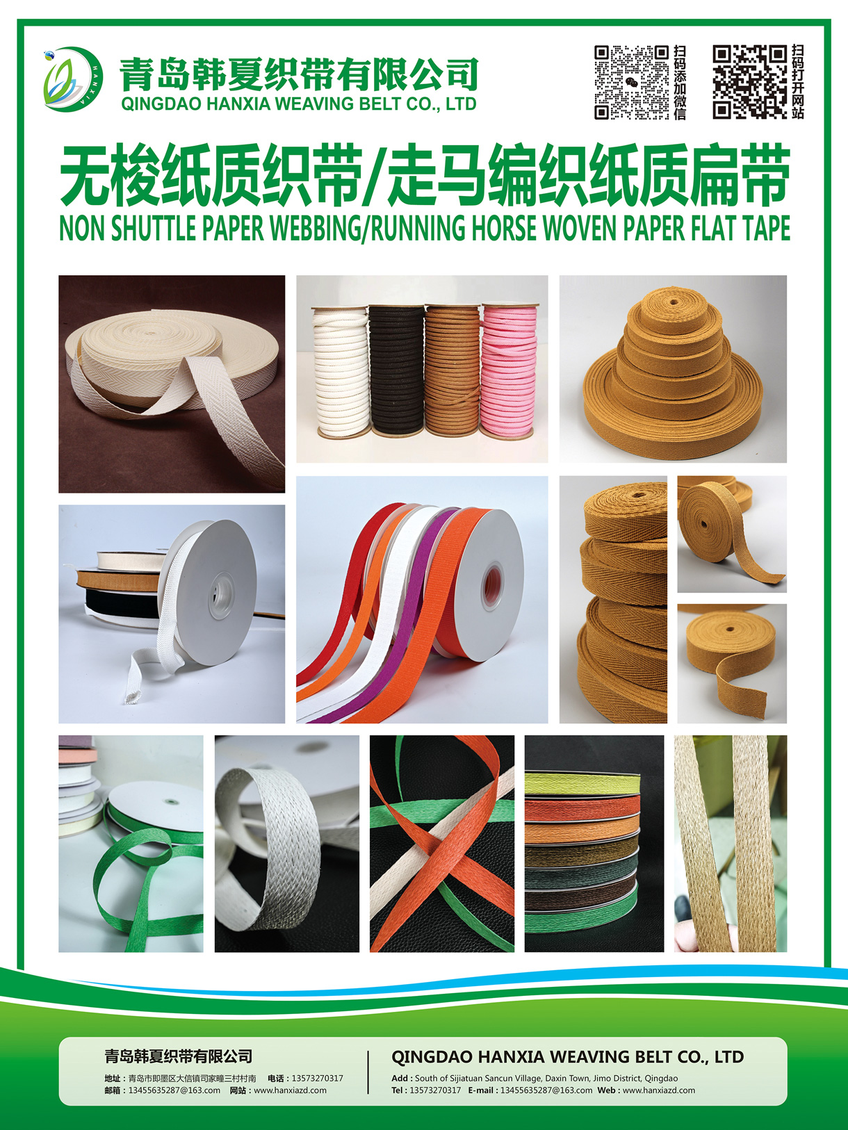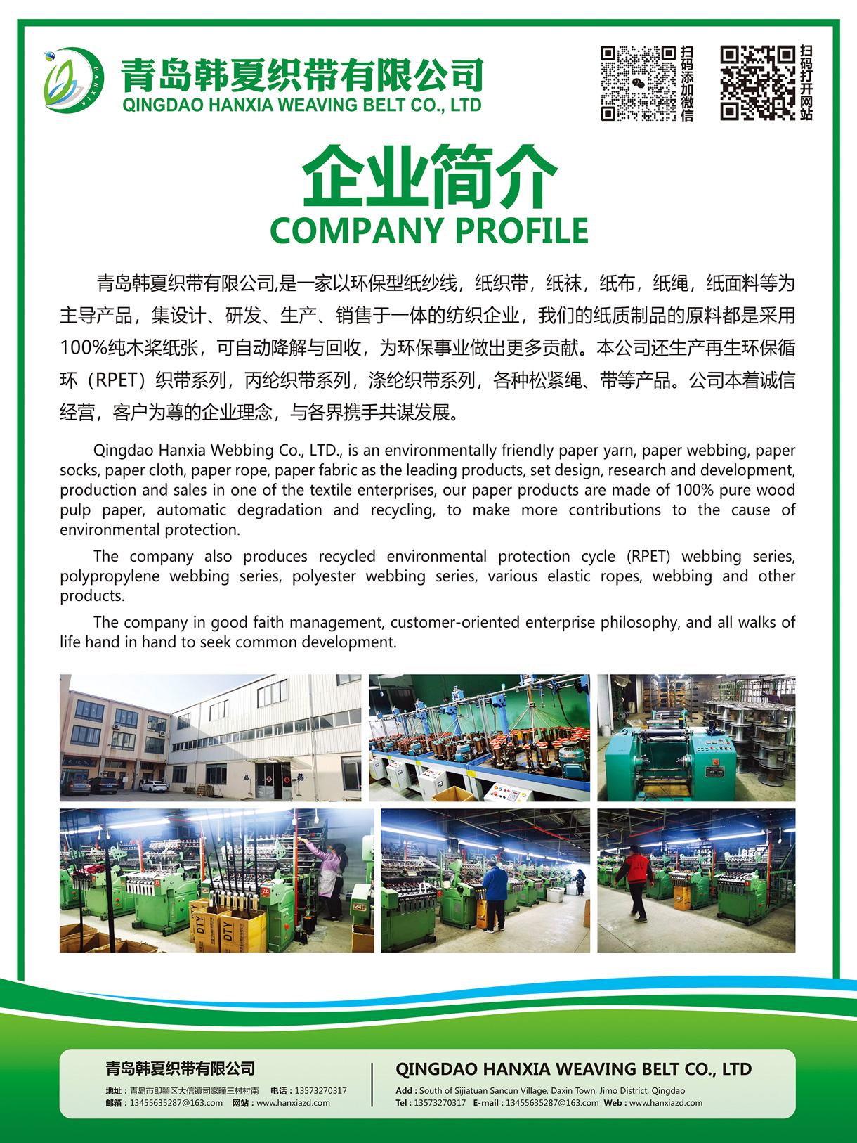 Qingdao Hanxia Webbing Co., LTD., is an environmentally friendly paper yarn, paper webbing, paper socks, paper cloth, paper rope, paper fabric as the leading products, set design, research and development, production and sales in one of the textile enterprises, our paper products are made of 100% pure wood pulp paper, automatic degradation and recycling, to make more contributions to the cause of environmental protection.