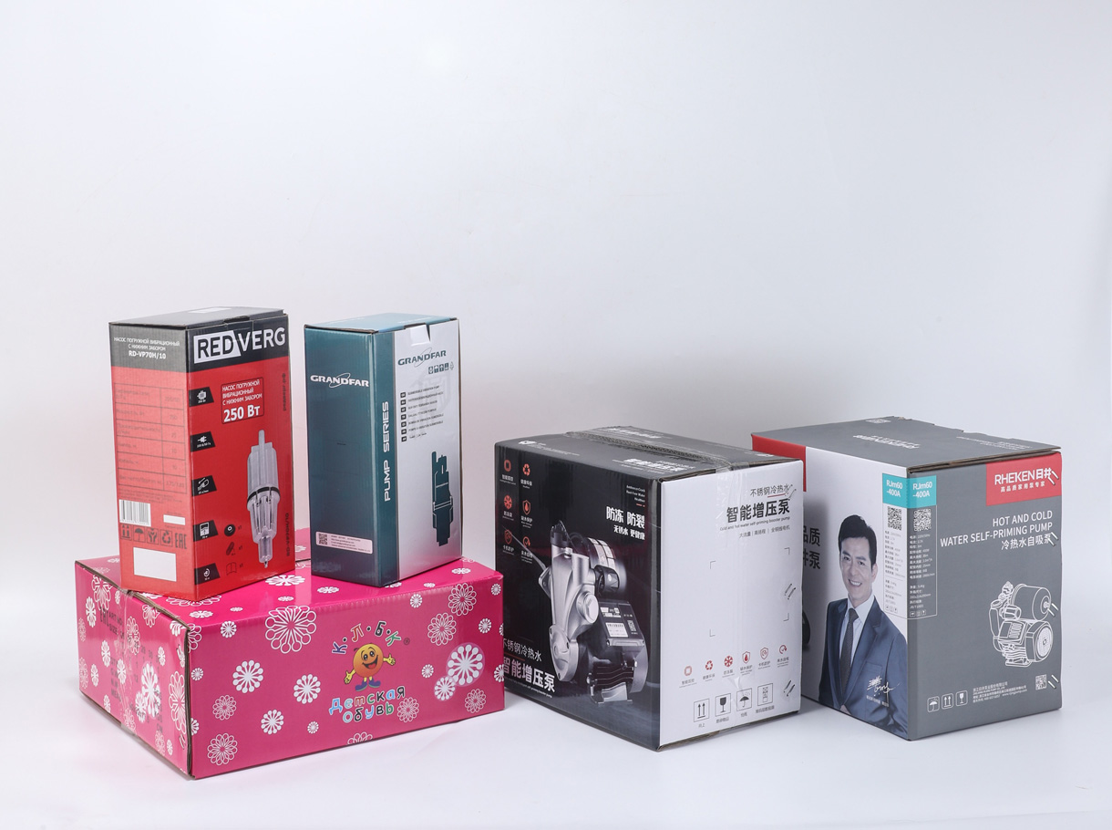 公司⽣产各类彩盒,⽜⽪纸盒,⽜⽪纸箱以及三层、五层、七层⽡楞纸箱和彩箱,吊牌,手提袋及蜂窝箱。尤其专注于鞋类包装盒的设计、⽣产和研发,以及水泵箱的定制,礼品盒的设计与研发,是浙江温岭定制包装的著名⽣产⼚家。